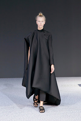 And at second sight the creations were really wearable. The silhouettes were varied and surprisingly fetching when models stood upright, ranging from a regal cutaway coat to a bulbous chubby sprouting those grass-like strands. Dresses had an S-curve in profile, extra fabric bunching at the small of the back and past the knees. They were amazing and I love all the shapes from the clothes.