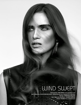Posing for the latest issue of Kalt Blut Magazine, model Henriette shows off wind-swept fashions for this editorial lensed by Sam Bisso. With her dark hair, feline features and piercing eyes; Henriette reminds us of a young Helena Christensen in these images. Stylist Christina Holzum dresses the beauty in an eclectic mix of metallic, mesh and leather for the photo shoot.